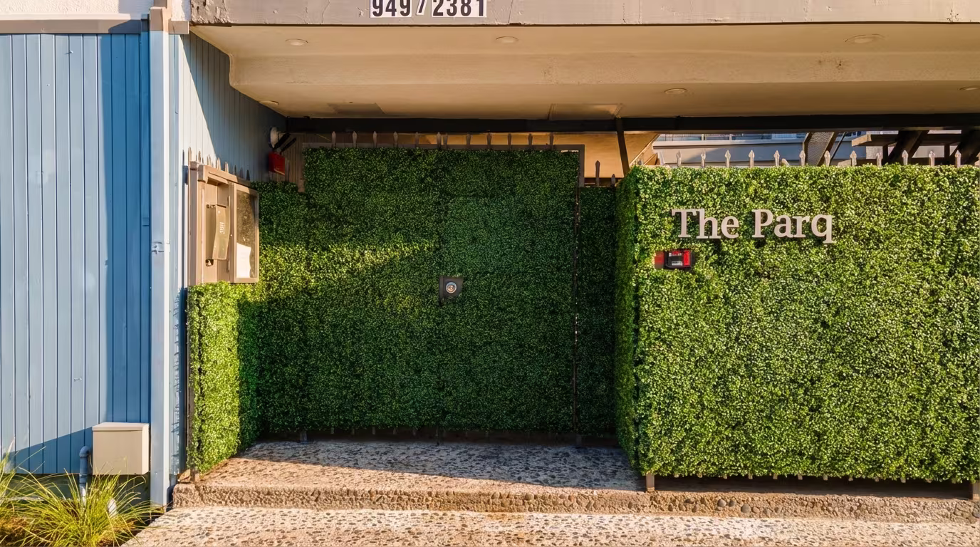 A Los Angeles property management team needed tenant privacy quickly without making a brand-new security gate look like an add-on. CalifauxScapes designed and installed a 360 sq ft artificial boxwood living wall using UV-stabilized materials for a dense, natural-looking finish.